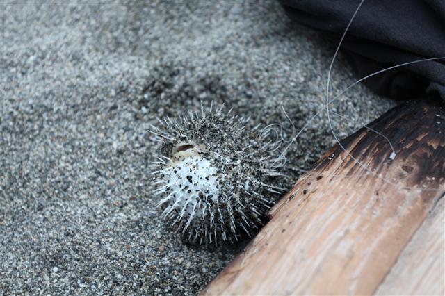 The fisherman caught a small puffer.